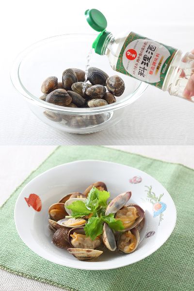 料理酒と一緒にレンジで加熱するだけで、簡単にあさりの酒蒸しが出来上がります。