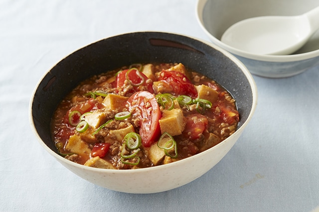 夏野菜の代表的な存在のトマトをたっぷりと使った麻婆豆腐です。トマトの酸味がさっぱりとした味わいに仕上げてくれます。具材には厚揚げ豆腐を使用することで、豆腐の水切りをする手間も省けますよ。