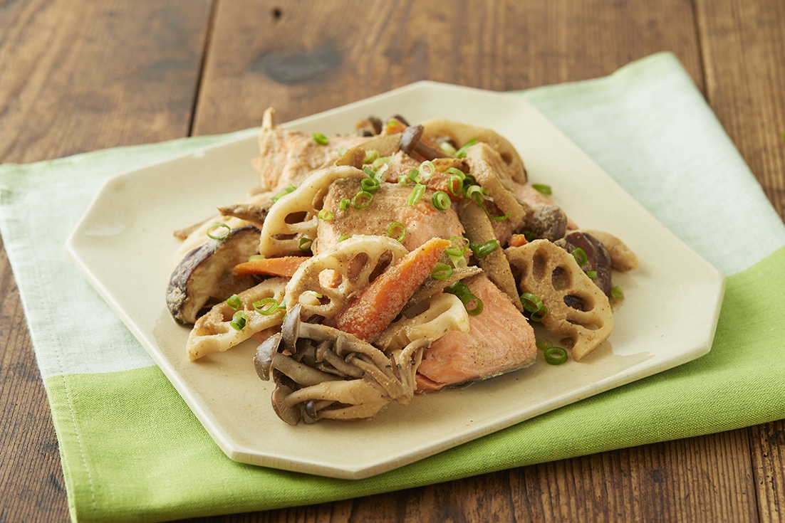 「鮭と秋野菜のごま煮」