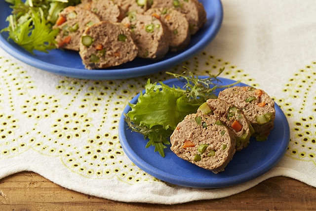 アスパラ・さやいんげん・にんじんを細かく切って、ひき肉と混ぜ合わせてフライパンで焼いたミートローフです。アルミホイルに包んで蒸し焼きにすると中まで火が通りやすくなります。