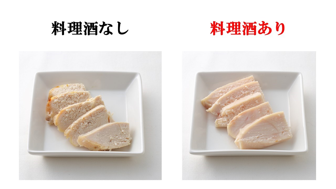 ※写真は鶏肉を蒸す際に、料理酒に漬けこむと仕上がりに変化が出るかを比較したものです。料理酒に漬け込む事で、鶏肉の水分を保ち、しっとりと柔らかく仕上げることができます。