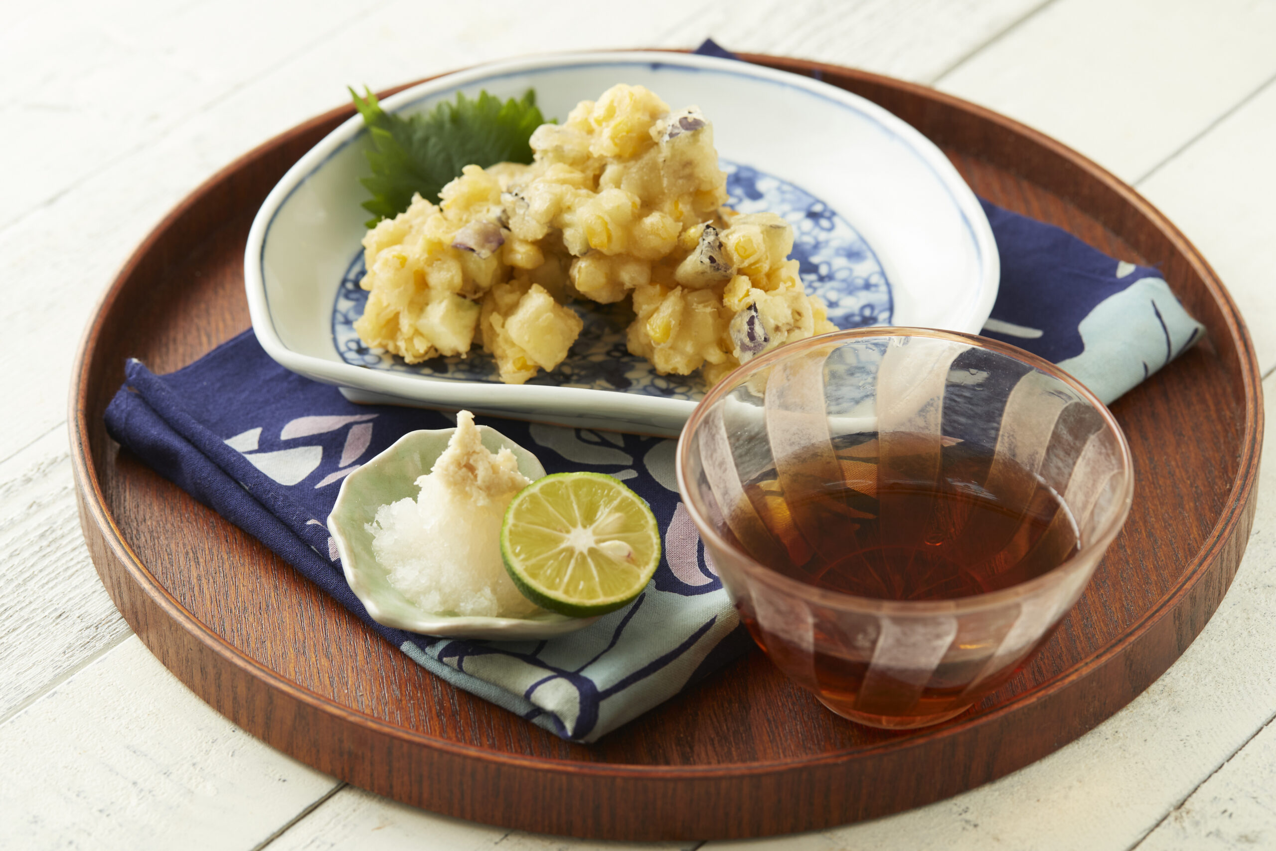 角切りにしたなす&とうもろこしをかき揚げにします。なすの淡白な味わいととうもろこしの甘みがぴったりです。