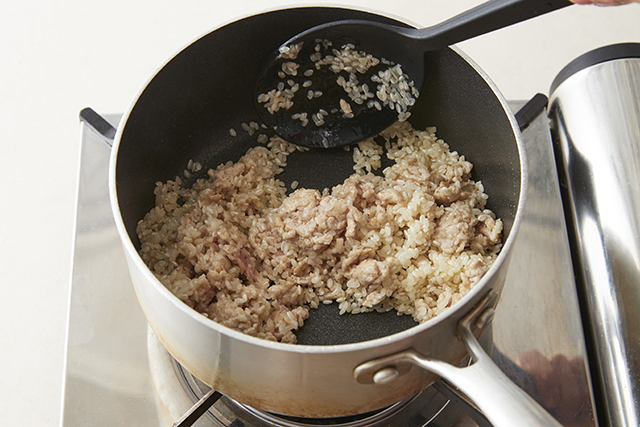 にんにくはみじん切りにしておく。小鍋にオリーブオイルとにんにくを入れ、弱火で熱する。にんにくの香りが立ったらひき肉を入れて、色が変わったら米を入れ透き通るまで炒める。